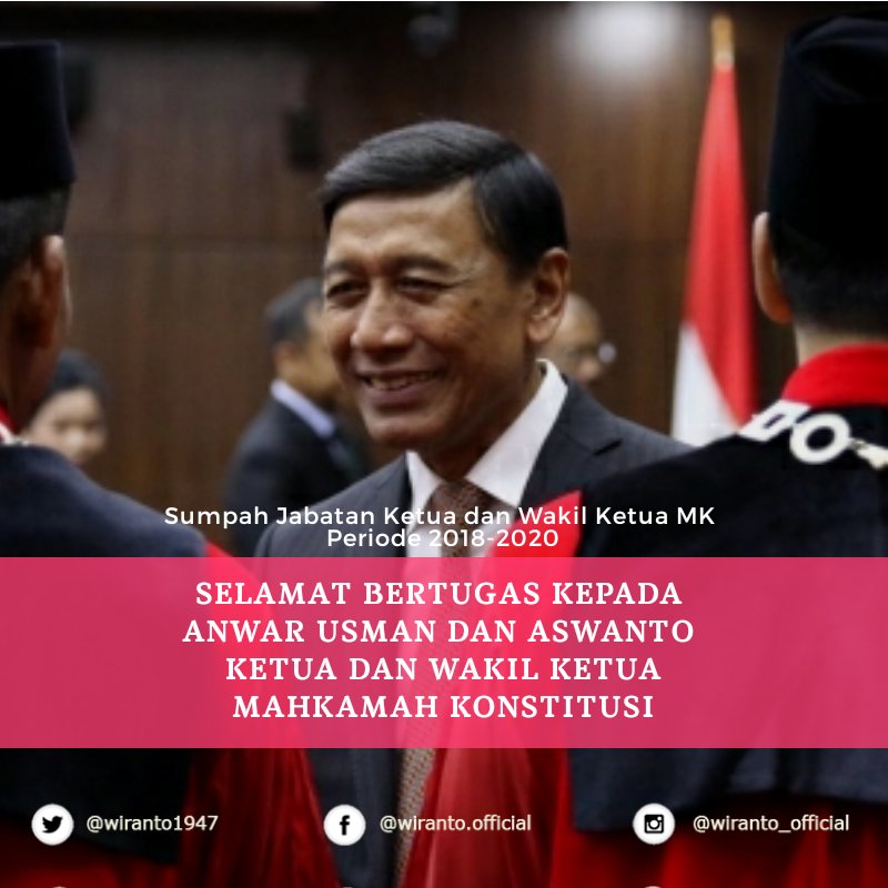 Wiranto sur Twitter : “Selamat bertugas Ketua dan Wakil Ketua Mahkamah Konstitusi periode 2018-2020, Anwar Usman dan Aswanto. Semoga selalu amanah menjaga konstitusi negara tercinta ini. @MK_RI @Humas_MKRI… https://t.co/CLo4PIdQpD”