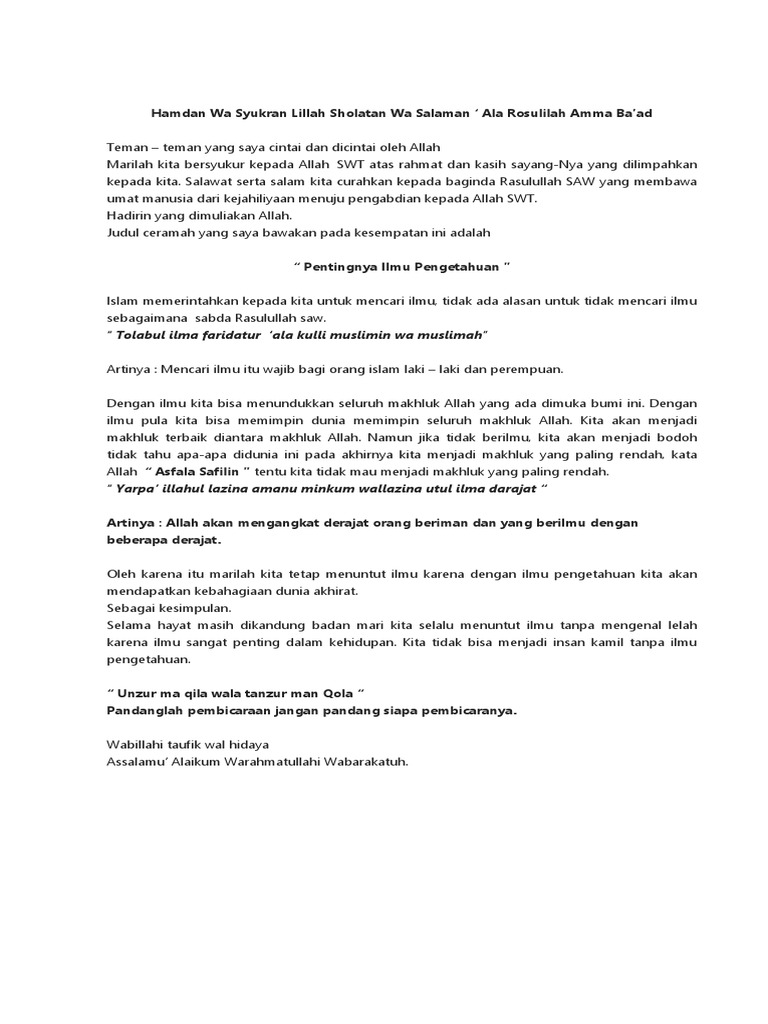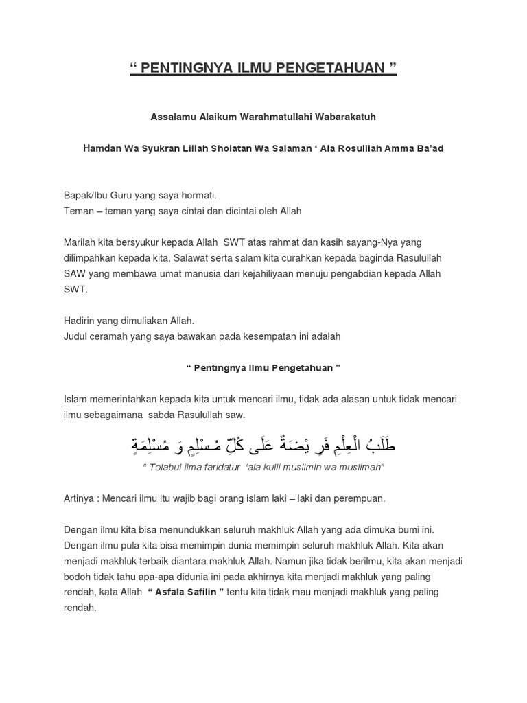 Ceramah Pentingnya Ilmu Pengetahuan.docx - Assalamu Alaikum Warahmatullahi Wabarakatuh Hamdan Wa Syukran Lillah Sholatan Wa Salaman \u2018 Ala Rosulilah | Course Hero