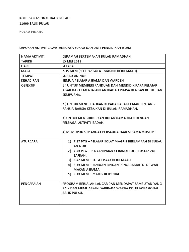 Laporan Aktiviti Jk Surau 2018 (Ceramah)