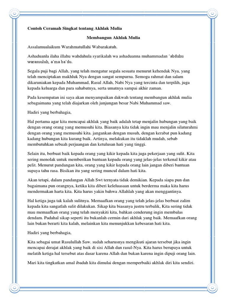 Contoh Ceramah Singkat Tentang Akhlak Mulia