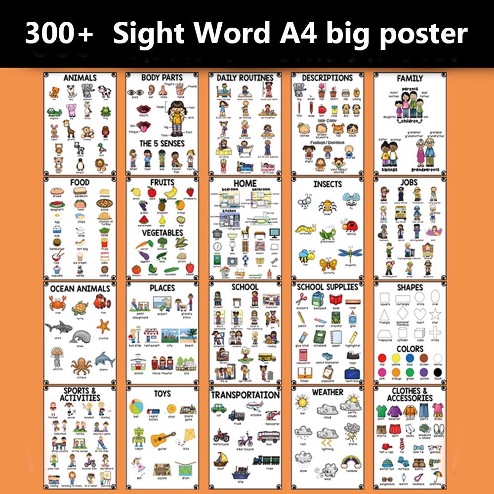 20Groups/Set A4 Size Cognition English Words Card Cartoon Poster …