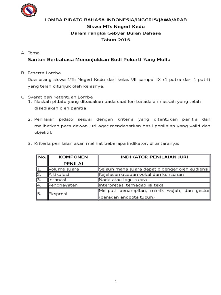 Contoh Format Penilaian Lomba Pidato Bahasa Indonesia - Yellow Jacke