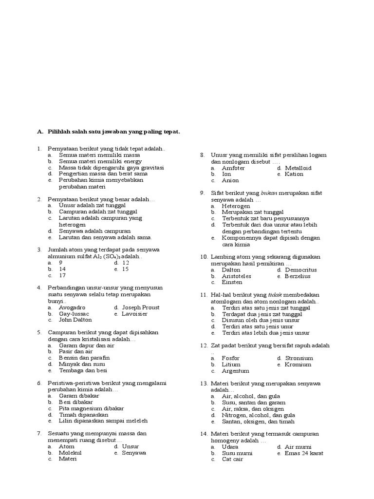 DOC) Soal Pilihan Ganda Kimia Kelas X Semester 1 & 2 | Irfan Kamal …