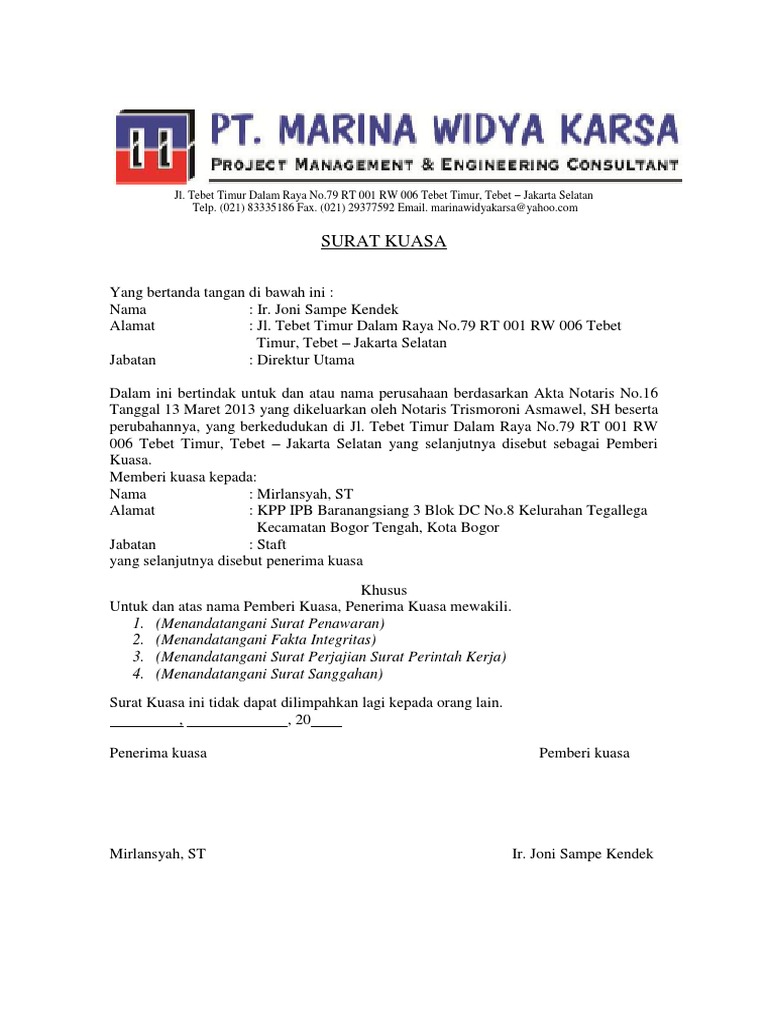 Contoh Surat Kuasa Mewakili Perusahaan Untuk Penandatanganan Perjanjian