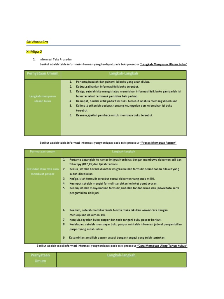 1. Mengonstruksi informasi berupa pernyataan-pernyataan umum dan tahapan-tahapan dalam teks prosedur Mengidentifikasi teks prosedur