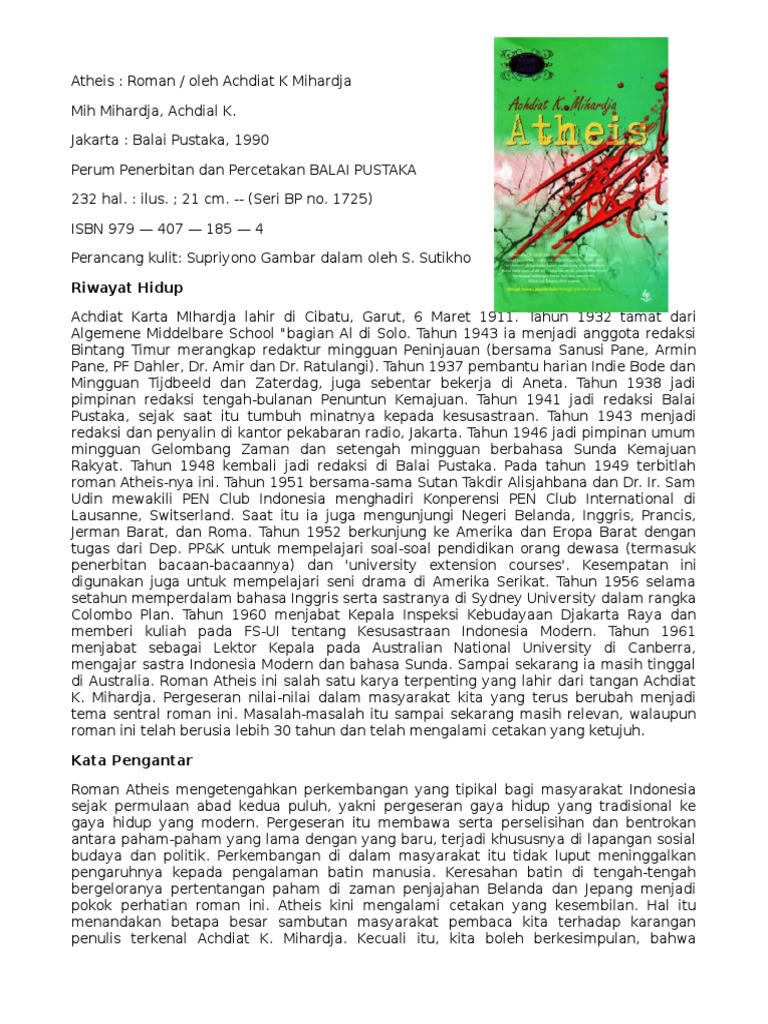 Identitas Buku Judul : Atheis Pengarang : Achdiat K. Mihardja Penerbit : Balai Pustaka Tahun terbit - Brainly.co.id