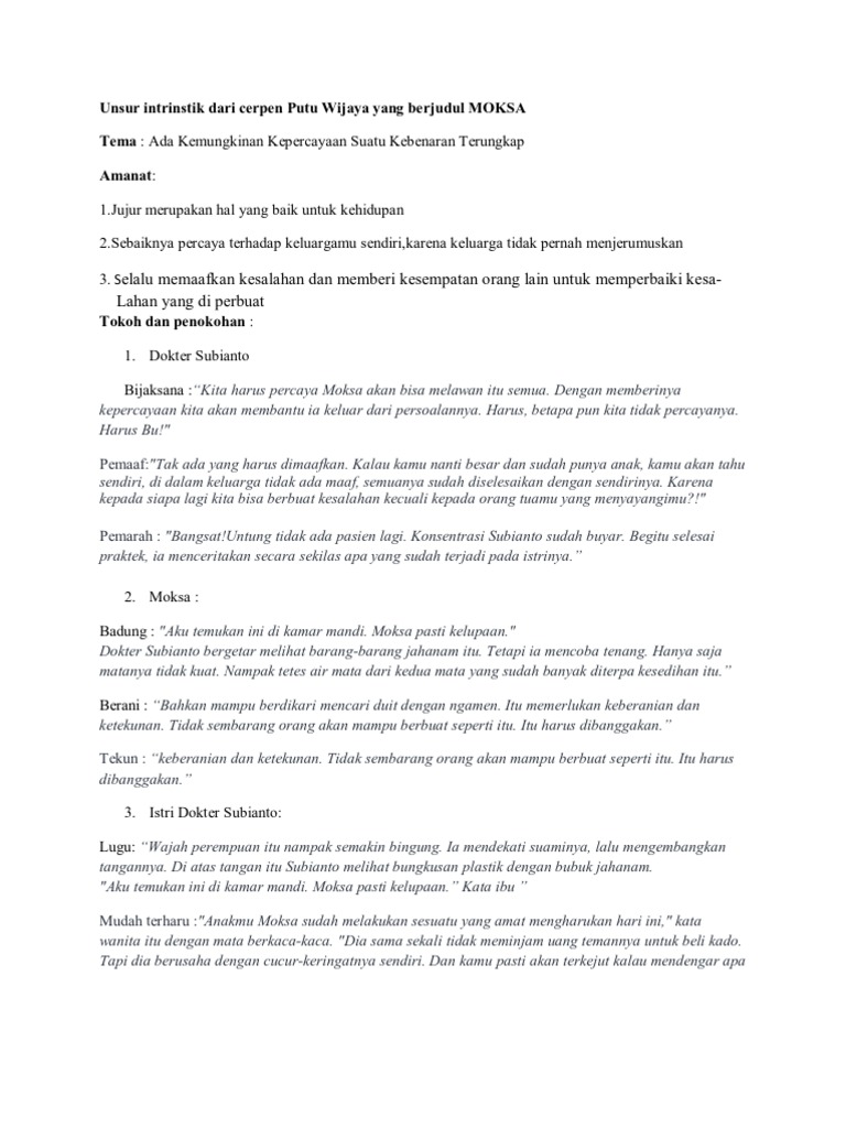 Unsur Intrristik Dari Cerpen Putu Wijaya Yang Berjudul MOKSA
