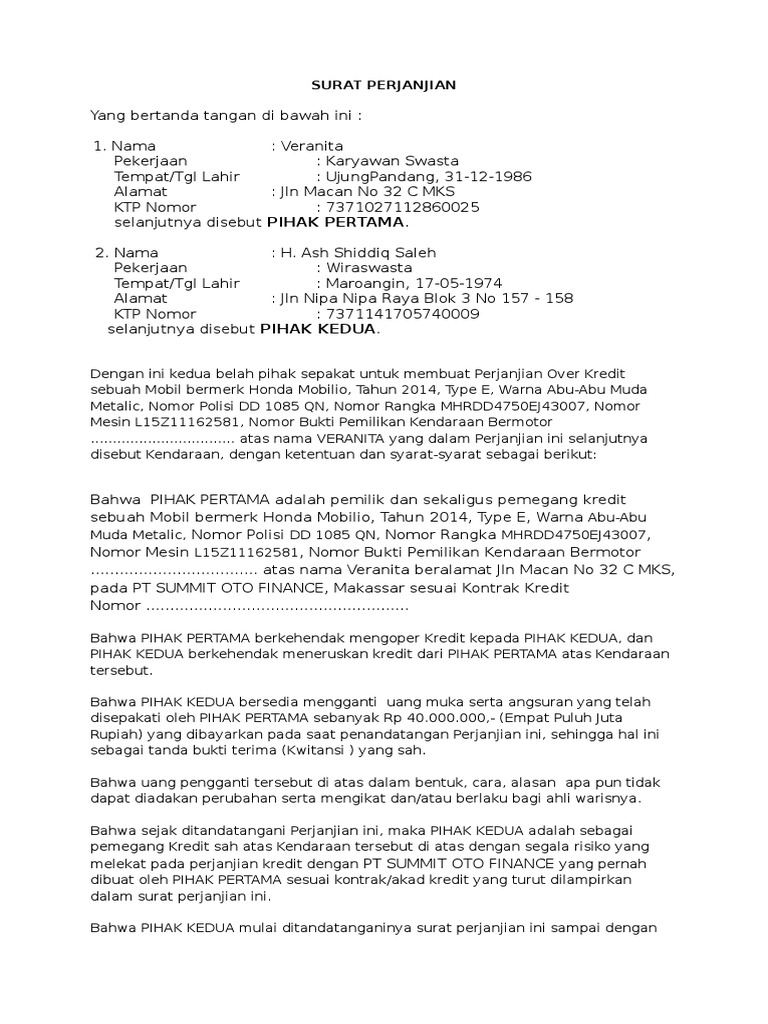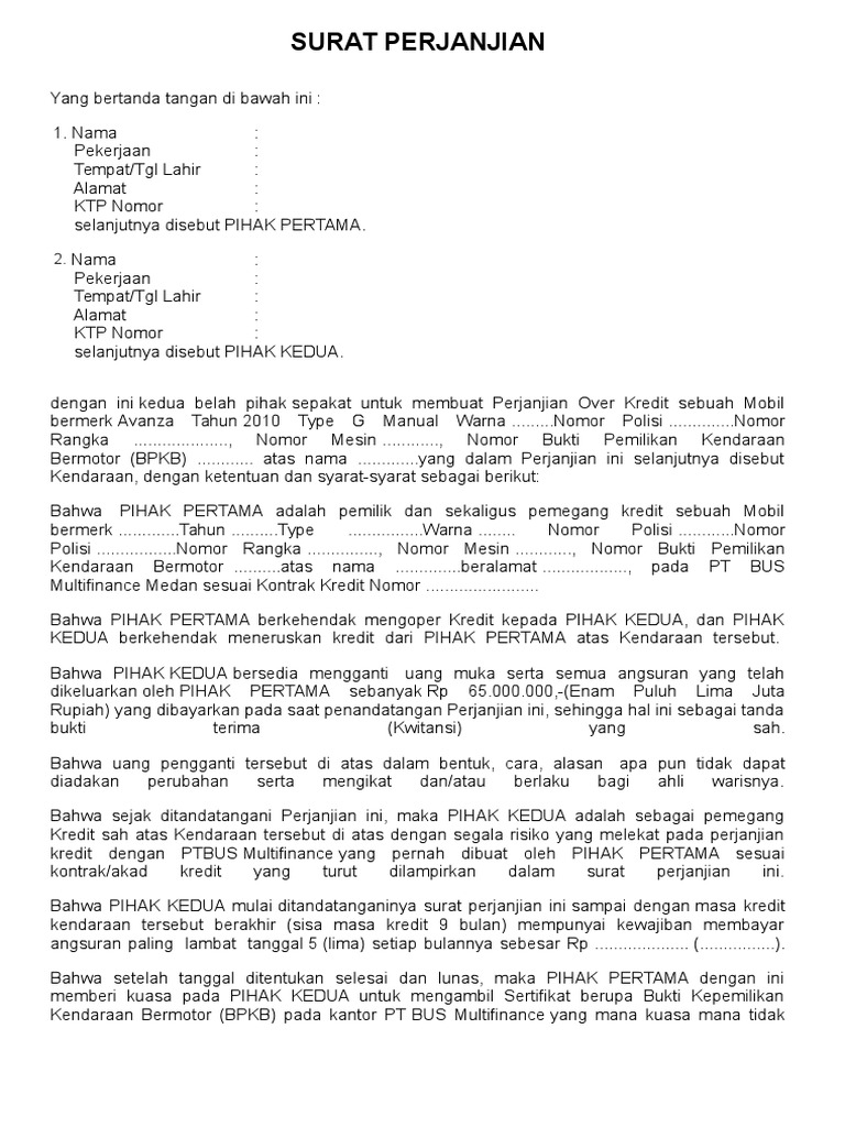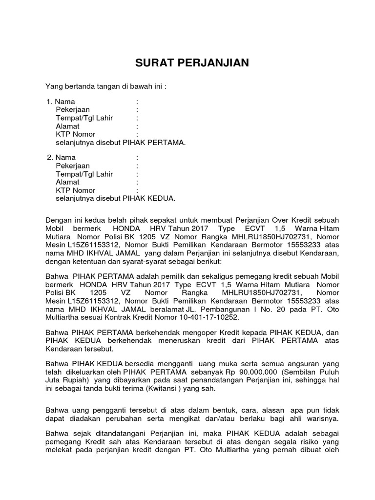 DOC) SURAT PERJANJIAN PINDAH TANGAN ANGSURAN MOBIL | Wanto Sahabat - Academia.edu