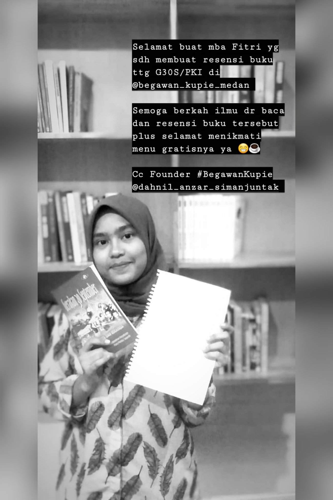 begawankupie : “Ayoo sobat, baca buku di #BegawanKupie buat resensinya dengan tulis tangan 2 lembar, nikmati 1 gelas kopi begawan atw 1 menu lainnya. Alhamdulillah, #BegawanKupie sudah tersedia di Kota Tangerang,