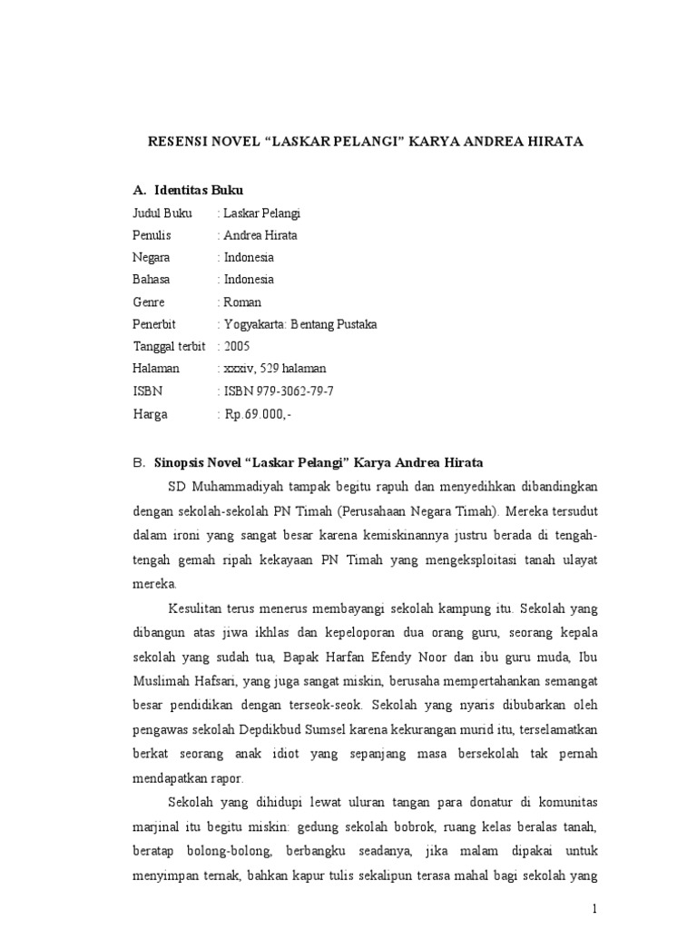DOC) Contoh Resensi Novel Laskar Pelangi Sinopsis Novel Laskar Pelangi Novel ini menceritakan tentang sepuluh anak Belitung yang tergabung dalam Laskar | Annissa Ari Mukti - Academia.edu