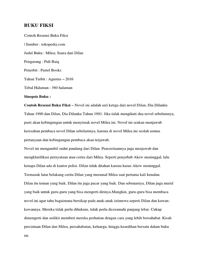 FIKSI.docx - BUKU FIKSI Contoh Resensi Buku Fiksi | Sumber tokopedia.com Judul Buku Milea Suara dari Dilan Pengarang Pidi Baiq Penerbit Pastel Books | Course Hero