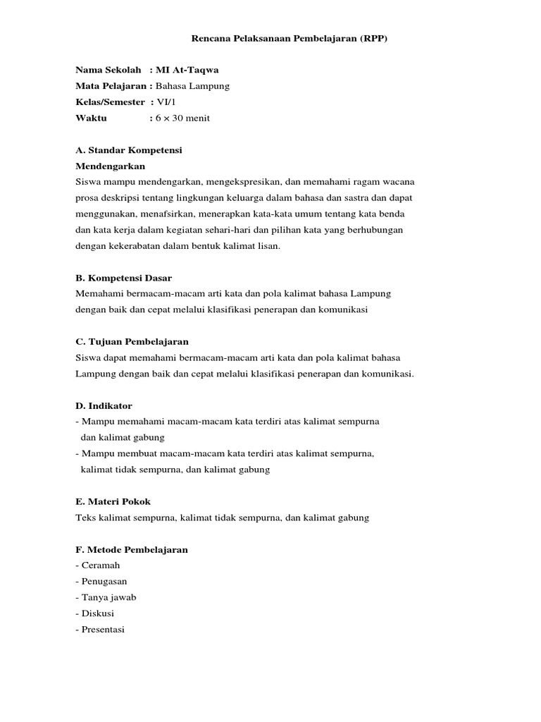 Rpp Bahasa Lampung Kelas Vii