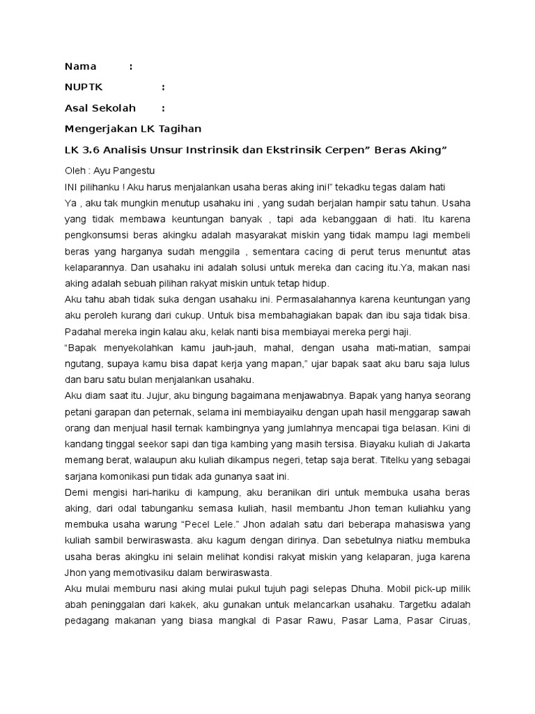 Nama: Hj. Norsaida Nuptk: Asal Sekolah: Smp Negeri 3 Banjarmasin Mengerjakan LK Tagihan LK 3.6 Analisis Unsur Instrinsik dan Ekstrinsik Cerpen” Beras Aking”